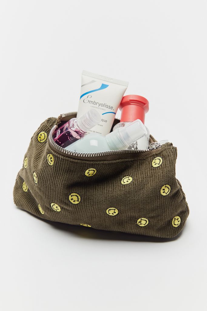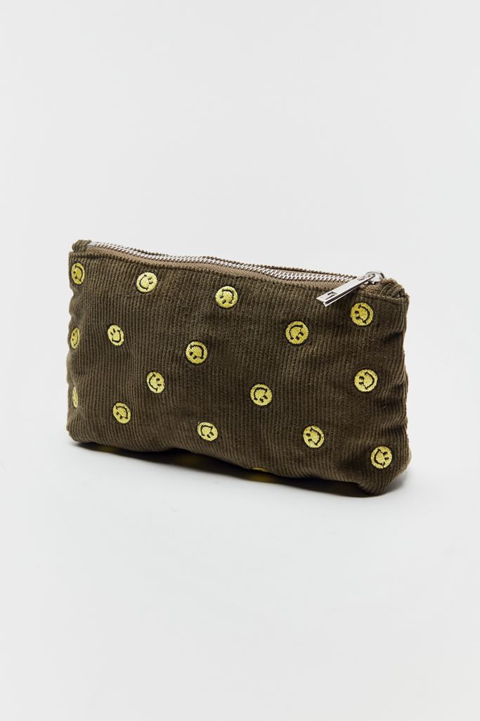 Cotton corduroy pouch featuring embroidered icons throughout. Perfect for playfully storing your cosmetics, makeup, school supplies and other loose end. Metal zip closure.