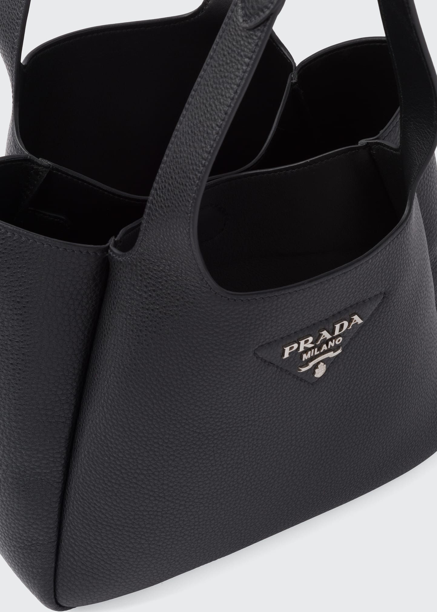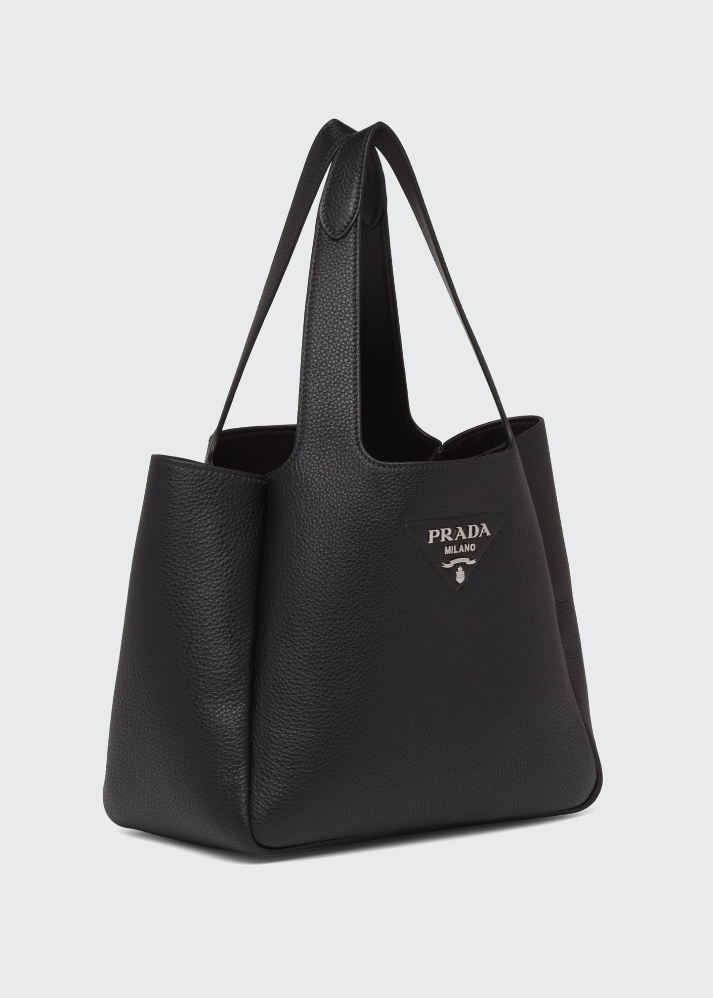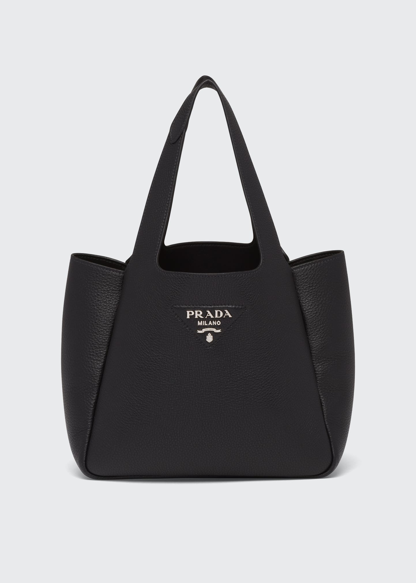 Prada shopper tote bag in soft calf leather features two side pockets. Metal lettering logo on the front. Magnetic button closure.