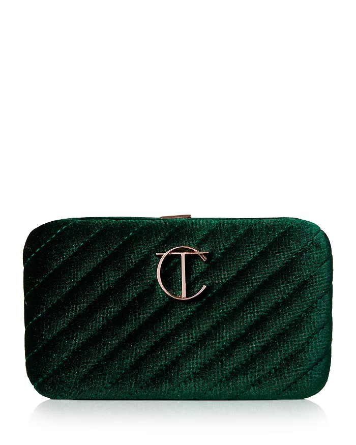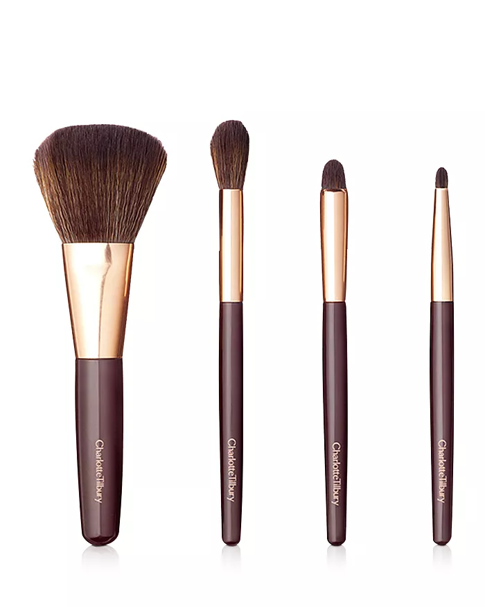 A selection of Charlotte’s best-selling synthetic mini makeup brushes in a limited-edition emerald-green velvet clutch bag.