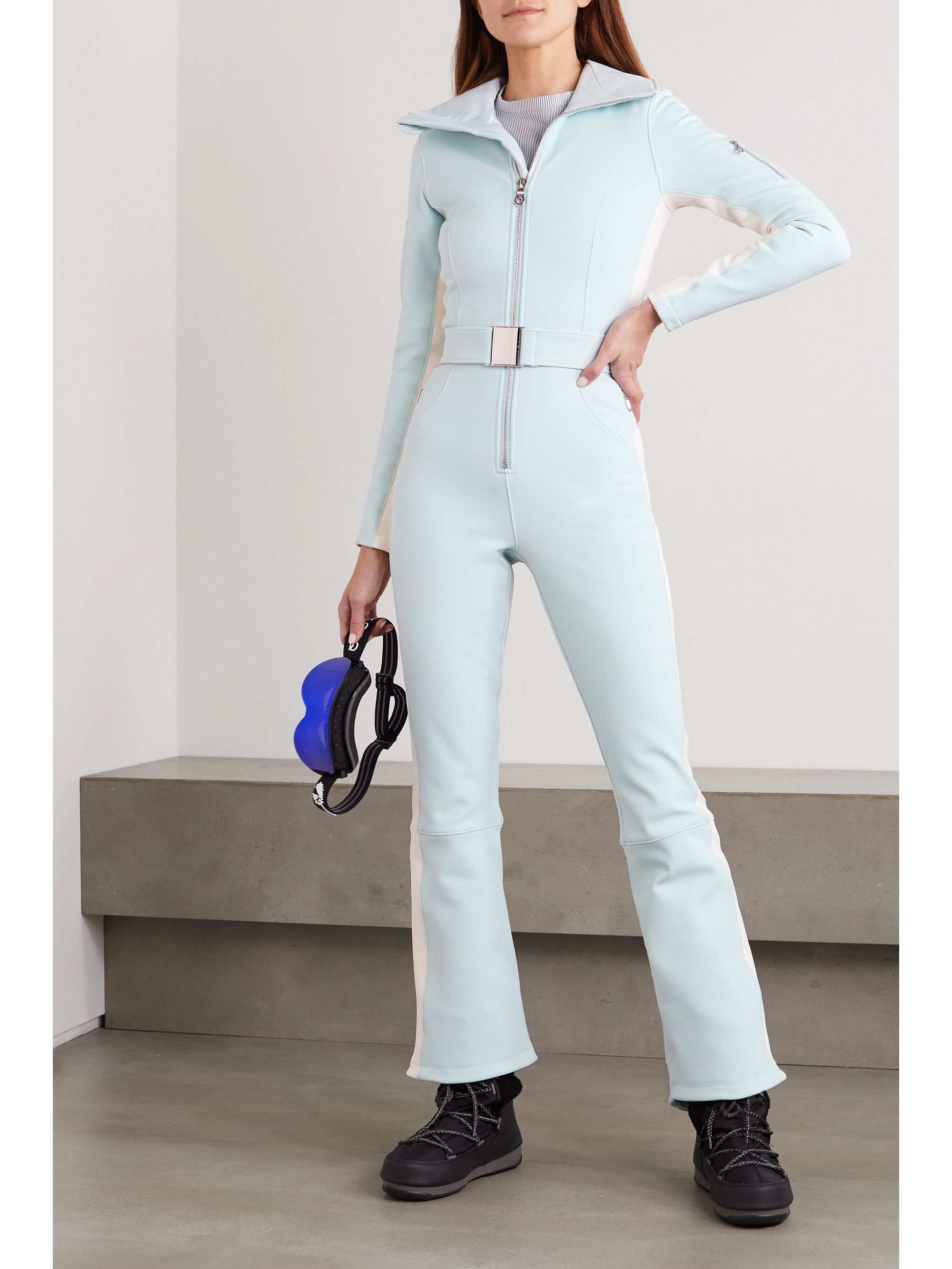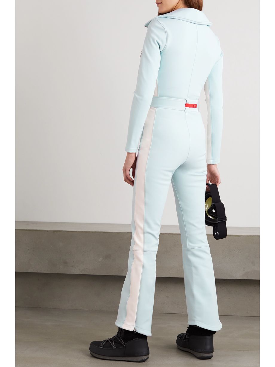 Designed with over-the-boot cover for heavier snow days, Cordova’s ‘Signature’ striped ski suit is made from the label’s Italian ’25k’ waterproof shell, which is enhanced with four-way stretch for unrestricted movement. This sky-blue and white style has an oversized funnel collar and fleece lining for optimum warmth. Silver Riri® hardware and a matching belt round it out with retro flair.