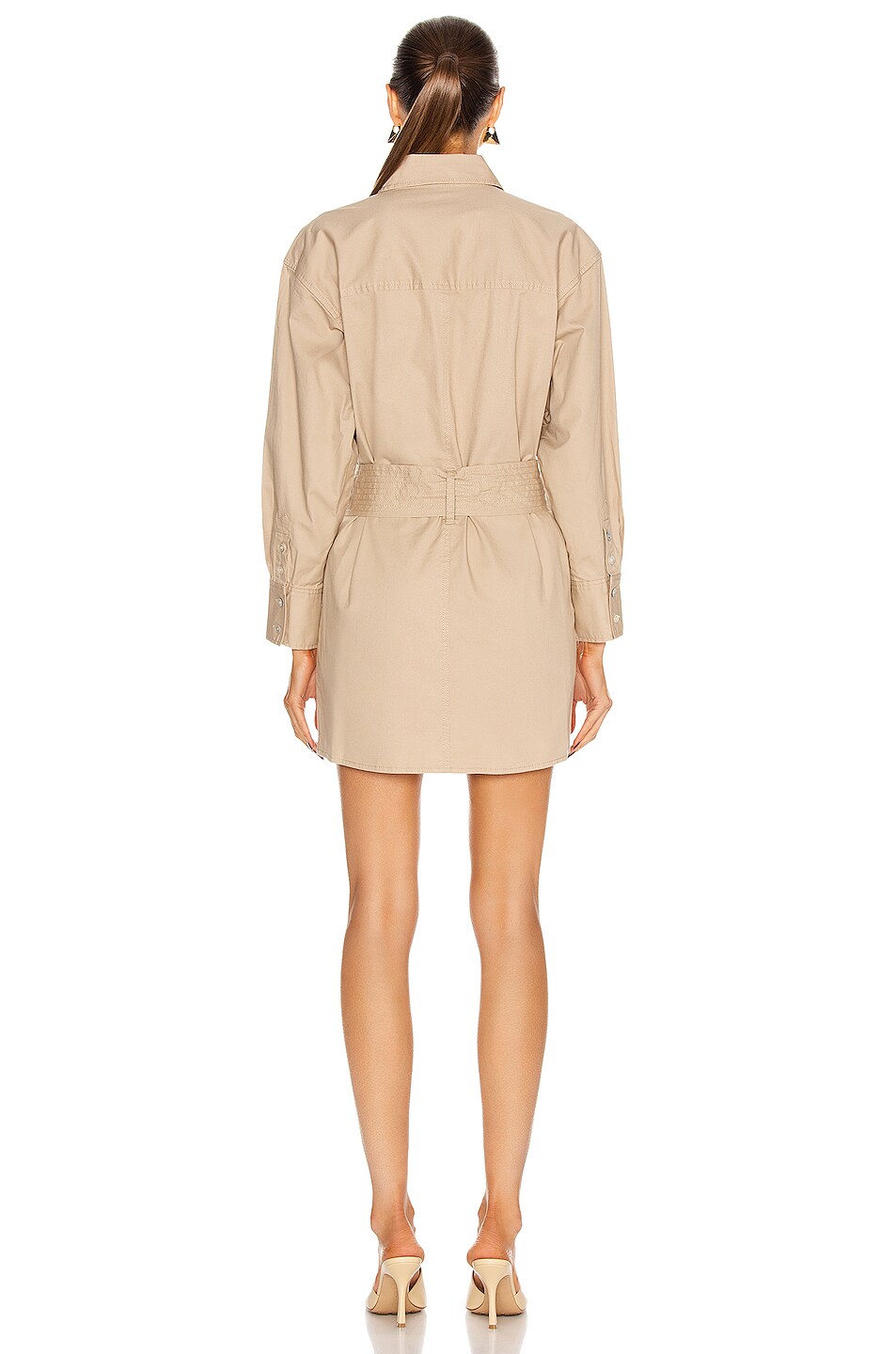 Button front closures. Breast flap pockets with button closures. Side slit pockets. Detachable waist tie. Barrel cuffs with button closures
