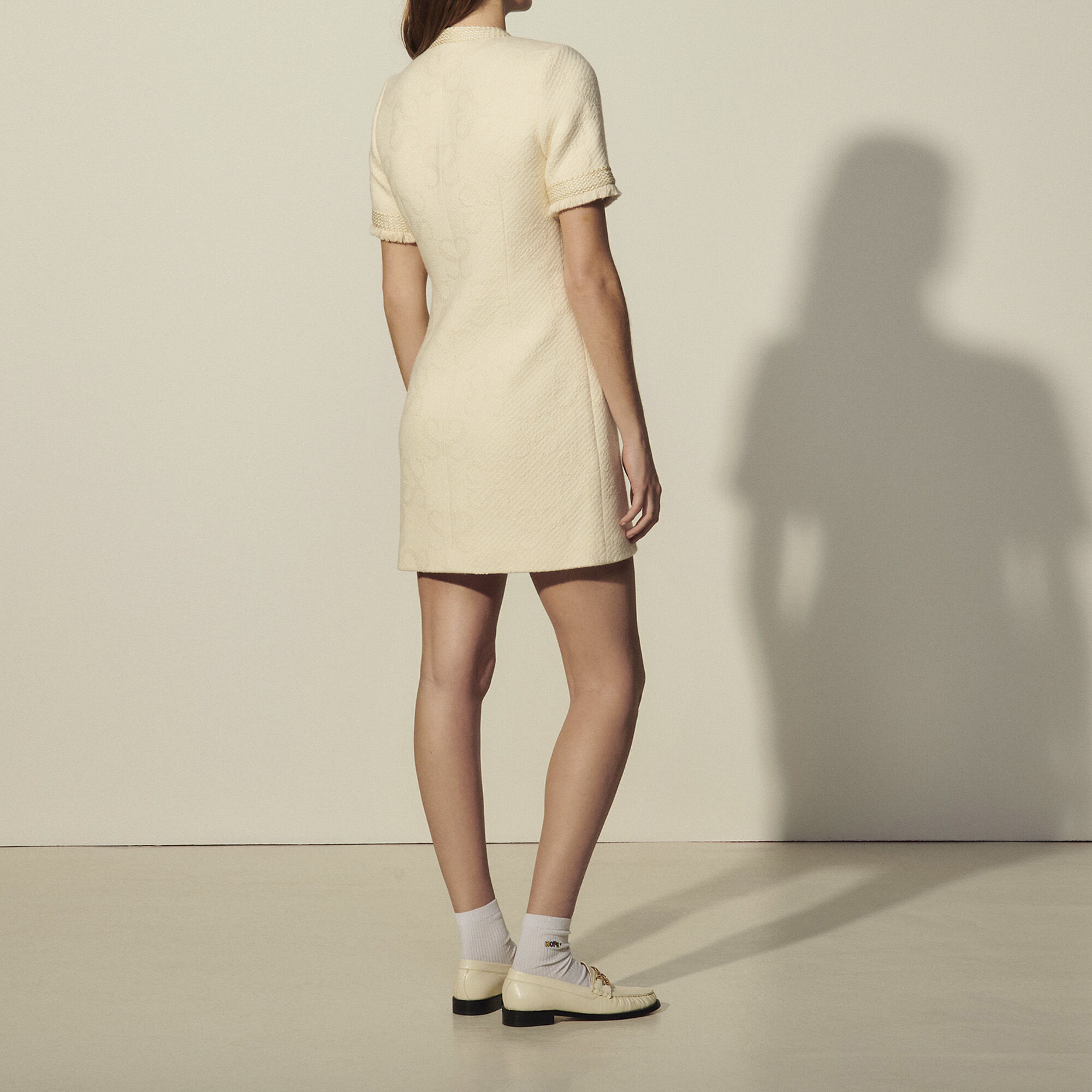 Short dress in double S jacquard tweed, V-neck edged with braid trim, Short sleeves with braid trim and fringing, Piped pockets on the front with braid trim and fringing, Centre front zip fastening