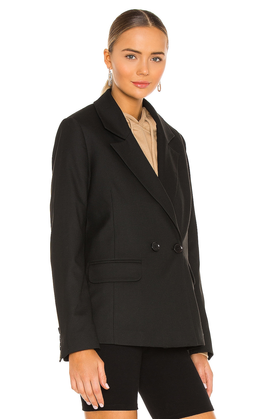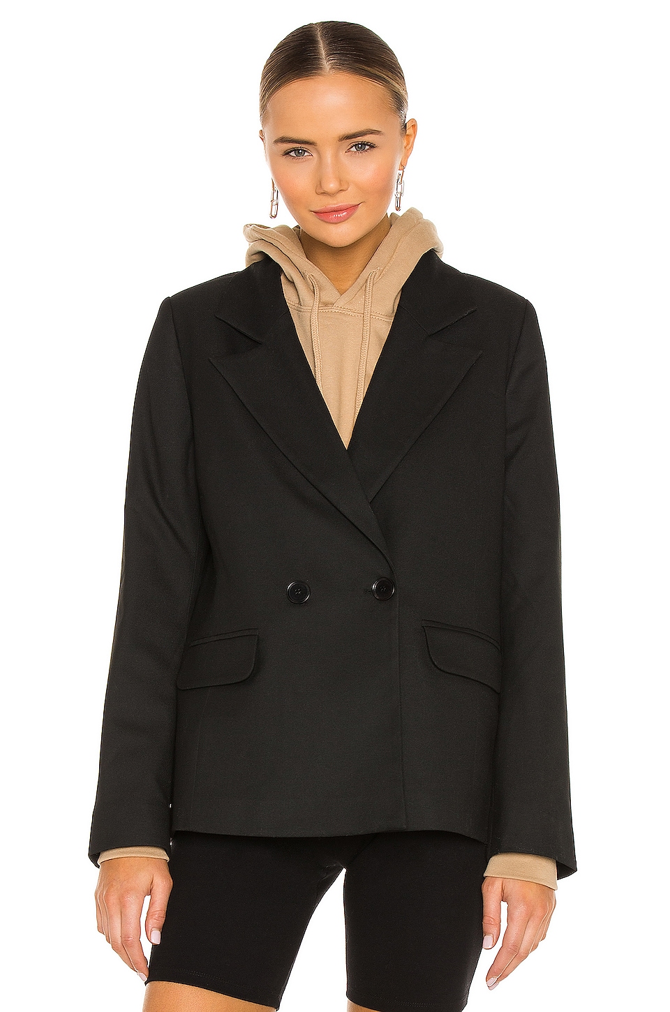 Wrap styling with single button closure, Padded shoulder with button detail at cuff, Back vent, Gabardine fabric