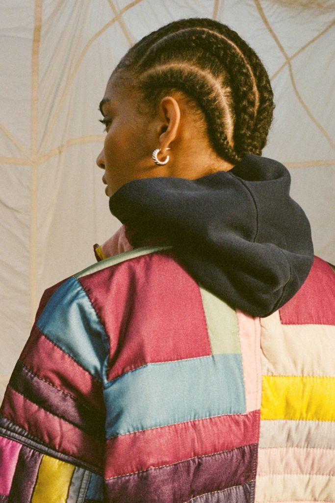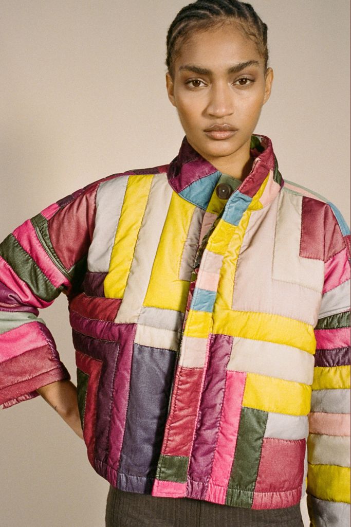 Quilted jacket from Kimchi Blue cropped to the waist with a snap closure. Finished with a floral lining