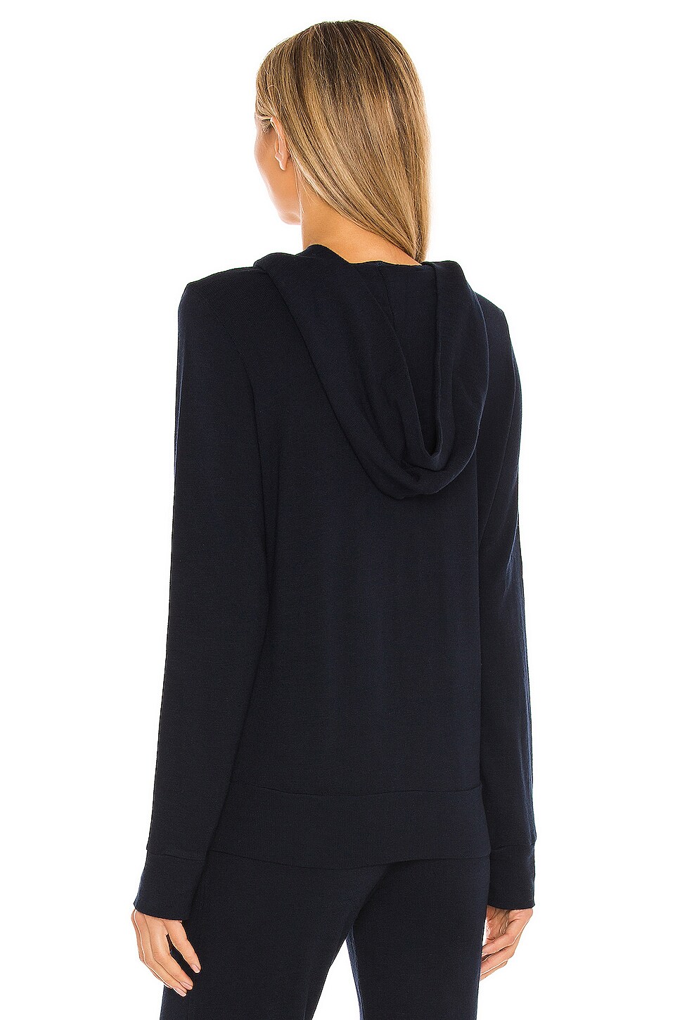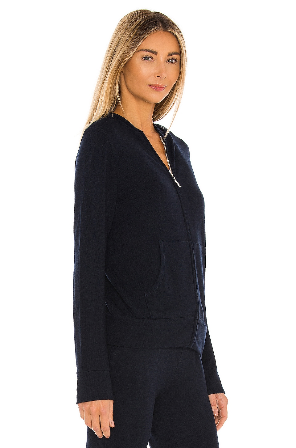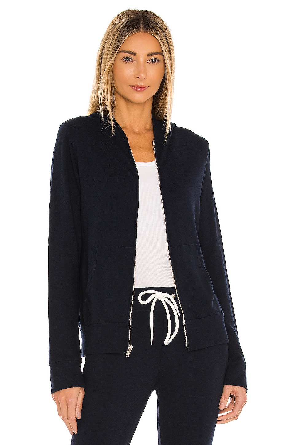 Front zipper closure, Side slant pockets, Attached hood, Ribbed trim
