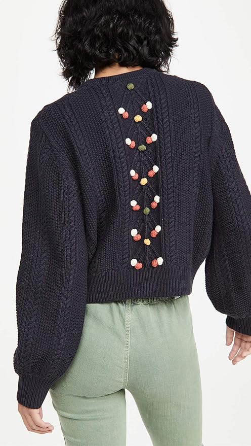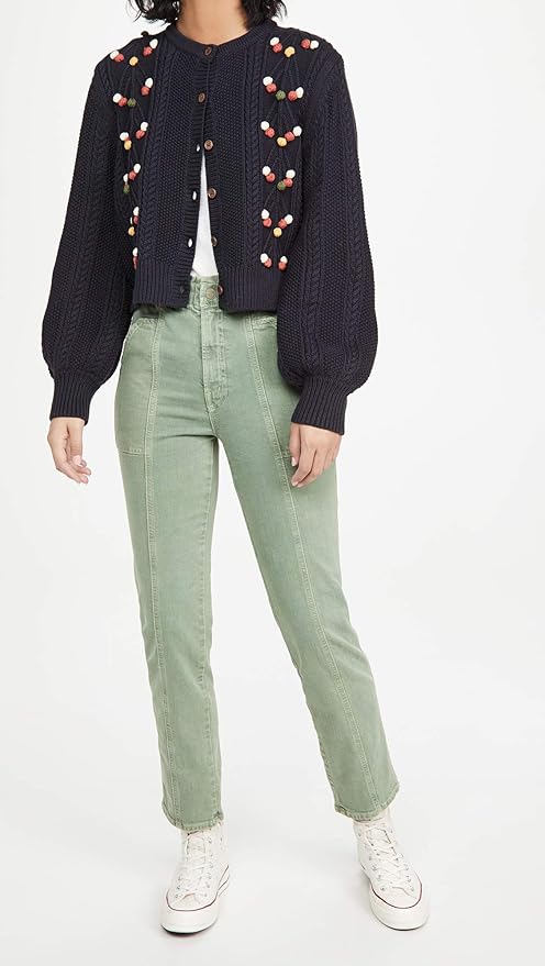 A charming knit cardigan from The Great., featuring sweet pom-pom trim and ribbed edges, while balloon sleeves modernize a classic silhouette.