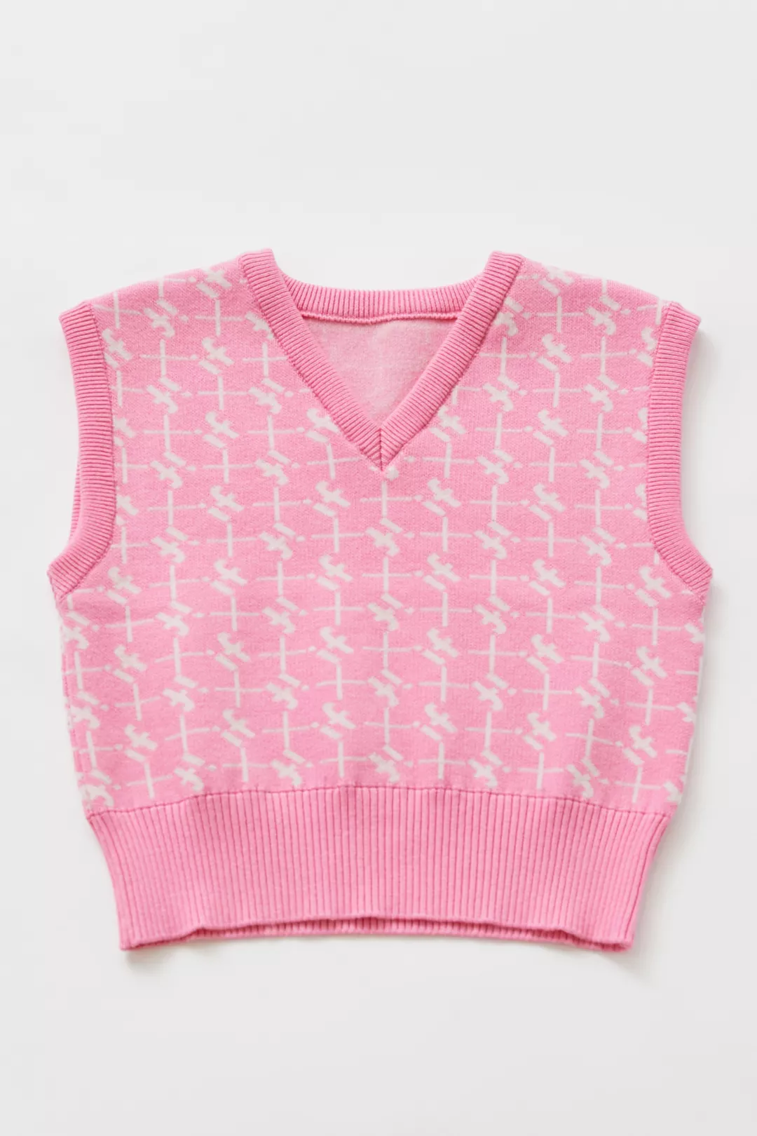 Preppy sweater vest from iets frans… cropped short at the waist with a slim fit. Crafted from an intarsia knit with branded monogram detailing. Sleeveless silhouette complete with ribbed trim and a v-neckline. Available exclusively at UO.