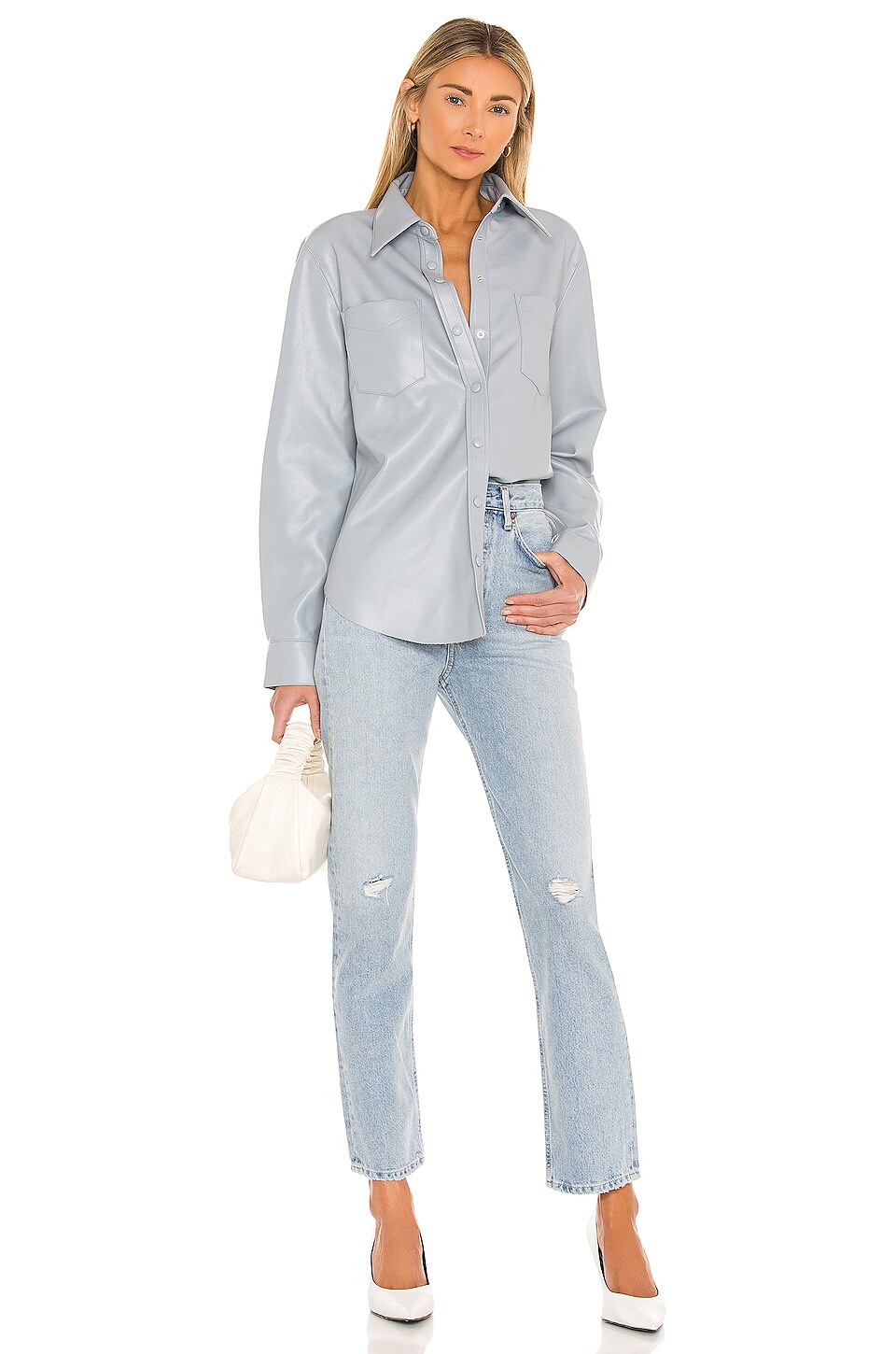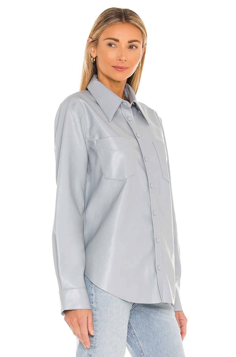 Front snap button closure, Breast pockets, Buttoned cuffs, Raw cut hem, Vegan leather
