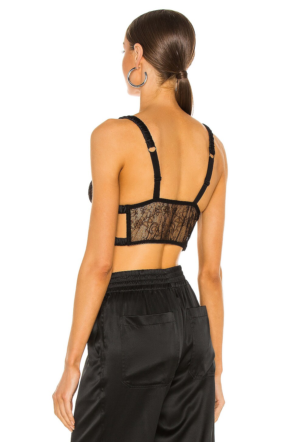 Elasticized adjustable satin shoulder straps, Unpadded, Boned sides with cut-out detail, Elasticized side satin straps, Underwire-free design, Sheer lace fabric