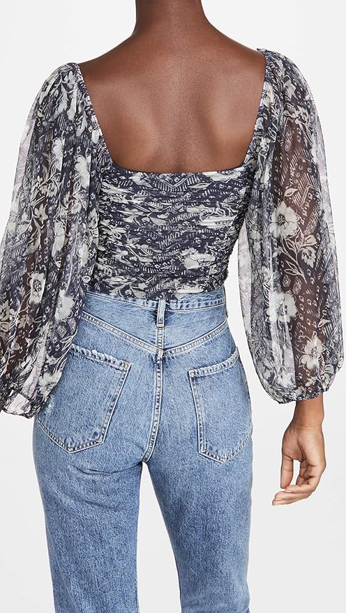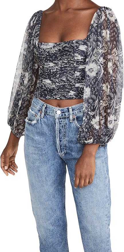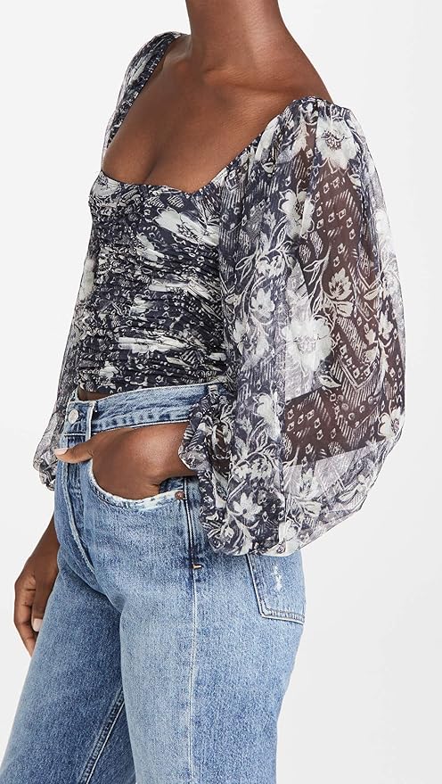 A Free People top cut from airy mesh, featuring sheer puff sleeves on a ruched bodice for a romantic statement that can be dressed up or down. Simply swap out black skinnies and heels for cutoff shorts and western booties.