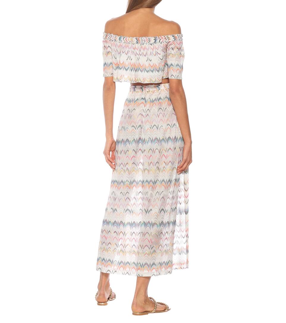 Missoni’s zig-zag crochet-knit designs were first debuted in the ’60s and, today, bring allure to pieces like this crop top from the label’s Mare line. The colorful piece is trimmed with ruffles and has an elegant off-the-shoulder silhouette. Slip yours over a bikini top for walks on the beach.