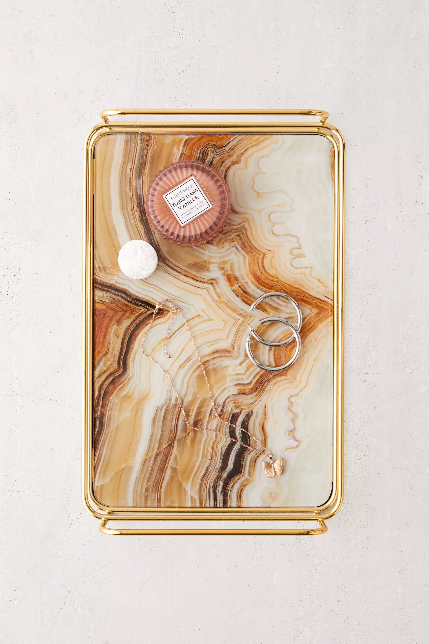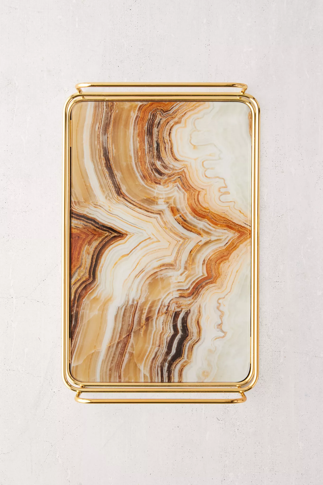 Elegant vanity tray featuring an iron structure with slim bars and side handles topping a glass base with a swirling onyx-inspired pattern. Exclusively available at Urban Outfitters.