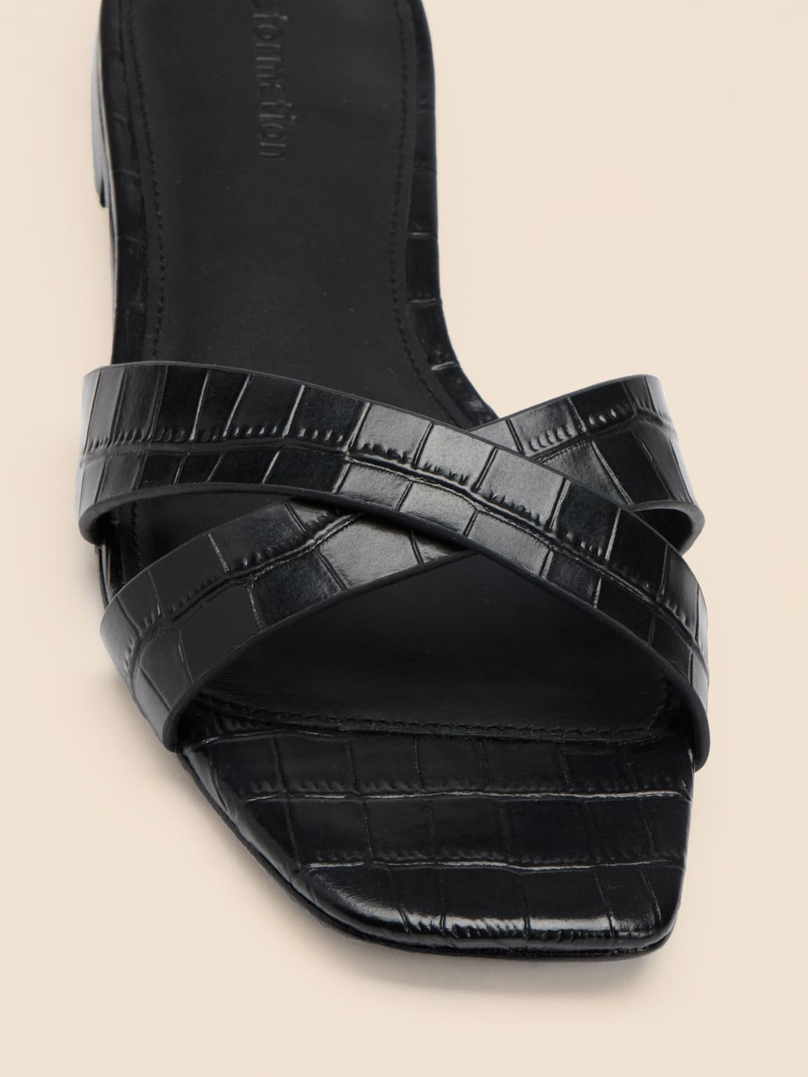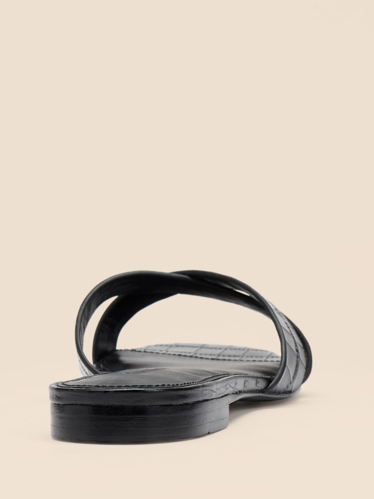 This is a flat sandal with two thick criss cross straps over the toes. The Margaret features a micro block heel. Pairs well with the Yucca Two Piece.